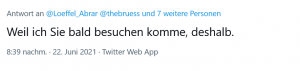 Derselbe Account drohte uns sodann via Twitter in einer Diktion, wie man sie als Zivilprozessanwalt an sich nur aus Mafiafilmen kennt („Besuch abstatten“).