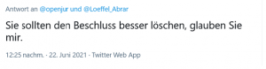 openjur, ein gemeinnütziger Verein in Hamburg, welcher den Beschluss in seiner Rechtsprechungdatenbank veröffentlichte, wurde bereits am Mittag des 22. Juni 2021 mit deutlichen Worten via Twitter aufgefordert, die Entscheidung des Oberlandesgerichts Frankfurt am Main zu löschen. Die Forderung stammt von einer Person, die sich nach der Entscheidung des Oberlandesgerichts Frankfurt am Main einen Fake-Account auf Twitter eingerichtet hatte und hierzu  den Namen eines Vorsitzenden Richters am Oberlandesgerichts Frankfurt am Main nutzt (u.a. verbreitete diese Person auf Twitter, der 6. Zivilsenat des Oberlandesgerichts Frankfurt am Main sei bei der Asconi-Entscheidung wohl befangen gewesen und vermutlich hätten einige Beteiligte „selbst eine Schöffel Jacke“ oder ein „Parteibuch der Linken“ zuhause). An @openjur schrieb die Person folgendes: