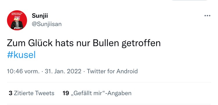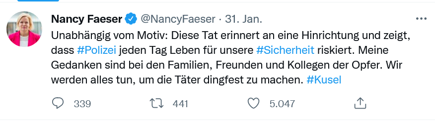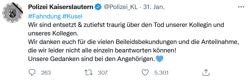 Der Blog Volksverpetzer hat erschreckende Beispiele zusammengetragen (hier abrufbar: „Widerlich! Querdenker bejubeln die Morde an Polizisten aus Kusel„).  Wer am 31. Januar 2022 – am Tag der Tötung der Polizisten – #Kusel bei Twitter eingab, fand bei einer schnellen Suche zum Beispiel folgende Tweets: