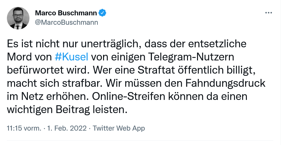 Auf Telegram werden die Tötungen der Menschen befürwortet: 2 weniger bei den Spaziergängen“ „Dem Täter ein spendenkonto…“ Telegram unternimmt – wie immer – nichts. Niemand stoppt diese Hater. Rechtsdurchsetzungsfreie Räume. Der deutsche Rechtsstaat scheint machtlos („Justizminister Buschmann hat eine neue Idee„). Ein „Offenbarungseid“ des deutschen Rechtsstaats? Zahnlos sei der Rechtsstaat nicht, schreibt der Rechtsprofessor Dr. Arnd Diringer in seiner Kolumne in der WamS („Im Schattenreich der Messenger-Dienste„). „Durch klassische Kriminalarbeit können jetzt schon Tatverdächtige ermittelt werden“, so wird der Kriminologe Thomas-Gabriel Rüdiger zitiert. Die Politik reagiert: