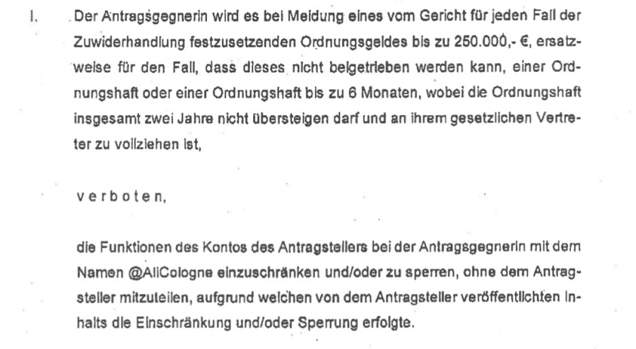 Aktualisiert am 10. Oktober 2022 Jack Dorsey, ehem. CEO des Mikroblogging-Dienstes Twitter, und Vijaya Gadde, Chefjuristin bei Twitter, stellten sich im Mai 2019 den Fragen des Podcasters Joe Rogan und des Journalisten Tim Pool. In der Diskussion ging es insbesondere um die in den USA heftig umstrittene Praxis von Twitter, Accounts zu sperren und Beiträge (sog. Tweets) zu löschen. Dorsey und die Juristin Gadde betonten dabei – von Pool auf umstrittene Fälle angesprochen – immer wieder die angebliche Gesamtbetrachtung durch Twitter im Rahmen jedes Einzelfalls. Die Realität in Deutschland sieht anders aus: In Deutschland werden regelmäßig Twitter-Accounts gesperrt. So zum Beispiel der Account des Autors Tom Hillenbrand (Heise) und des Juristen Prof. Dr. Arnd Diringer. Twitter gibt den gesperrten Nutzern vor der Sperre ihrer Accounts keine Gelegenheit zur Stellungnahme. My way or the highway, wie der Journalist Pool sagte. Was kann man als Nutzer gegen Sperren und Löschungen durch Twitter, Facebook, LinkedIN etc. unternehmen? _________________________ Inhaltsverzeichnis 1.Fallbeispiele #Twittersperrt (hierzu Heise und F.A.Z.). Der Account des Autors Tom Hillenbrand wurde 2019 gesperrt und blieb mehr als 200 Tagen gesperrt. Twitter reagiert nicht. Erst als der Schriftsteller seinen Tweet löschte, wurde sein Account wieder entsperrt. Am 15. Dezember 2019 sperrte Twitter den Account des Juristen Prof. Dr. Arnd Diringer. Er hatte zuerst auf einen Tweet der Deutschen Bahn zu Greta Thunberg Bezug genommen. Sodann hatte er die Erklärung von Greta Thunberg wiedergegeben und damit die Äußerungen beider Seiten – DB und Thunberg – dargestellt (Tweet von Prof. Dr. Diringer hier). Als sich jemand an dem ersten Tweet von Diringer störte, reagierte er auf dieses Verhalten (nicht auf das von Greta Thunberg!) ironisch. Das „erfüllt in meinen augen den „Wahrscheinlich hat der Algorithmus von Twitter die Aufforderung „Auf den Sch…haufen…“ als gegen andere gerichtet interpretiert. Dabei meinte @Arnd_Diringer satirisch übertrieben sich selbst.„ Der Chefredakteur Welt am Sonntag Johannes Boie kommentiert die Sperre zutreffend wie folgt: „Twitter hat den sachlich argumentierenden, klugen Juraprofessor @Arnd_Diringer gesperrt. Ein neuer Tiefpunkt der sozialen Medien im Umgang mit der #Meinungsfreiheit. Ein neuer Erfolg fürs Denunziantentum.„ Die Politikerin Nicola Beer kommentiert die Sperre von Diringer auf Twitter wie folgt: Am 26. Dezember 2019 wurde Ali Utlu gesperrt, und zwar ohne dass ihm der sanktionsauslösende Inhalt mitgeteilt wurde. Auf eine Abmahnung reagierte Twitter nicht. Das Landgericht Köln hat -am 14. Januar 2020 eine einstweilige Verfügung gegen Twitter erlassen – 28 O 11/20 – und Twitter verboten, die Funktionen des Kontos des Antragstellers zu sperren oder einzuschränken, ohne die Gründe für die Sperre zu nennen. Auch die Accounts von Rechtsanwälten werden immer wieder gesperrt. Warum, wissen sie dann meist selbst nicht: Und wer Kritik am gendern übt, wird bei Twitter auch gesperrt (Twitter-User wird gesperrt, weil er schreibt: „Gendern ist totaler Müll“, Berliner Kurier, 6. Oktober 2022). Ob bei Twitter eine Sperre durch Algorithmen (so die digitalpolitische Sprecherin der Links-Fraktion im Deutschen Bundestag, Anke Domscheit-Berg im Jahr 2022) oder durch Menschen (so Domscheit-Berg im Jahr 2019) erfolgt, ist nicht bekannt. Was kann man gegen Accountsperren gegen Twitter (gleiches gilt für andere soziale Netzwerke wie Facebook, LinkedIN, Instagram) in Deutschland unternehmen (siehe hierzu auch Laoutoumai/Löffel, Besteht ein Restore-Anspruch bei #twittersperrt?, K&R 2019, 447, hier frei abrufbar)? 2. Abmahnung Die Webseiten unter www.twitter.com werden laut Impressum von Twitter in Deutschland angeboten von: Twitter International Company, One Cumberland Place, Fenian Street, Dublin 2, D02 AX07, Ireland Telefax: 1-415-222-9958 / E-Mail: de-support@twitter.com Richtig lautet die Firma laut mit der Nummer 503351 laut der Eintragung im Companies Registration Office Irland TWITTER INTERNATIONAL UNLIMITED COMPANY – siehe https://www.cro.ie/en-ie/About-CRO/Overview Wer mit der Sperrung eines Tweets nicht einverstanden ist, kann bei Twitter Einspruch einlegen. Ein Einspruch bringt meist nicht. Im Gegenteil. Ein Einspruch kann die Situation verschlimmern. Das hat der Autor Hillenbrand getan, nachdem ihn Twitter aufforderte, einen Tweet zu entfernen. Nach dem Einspruch wurde sein Profil gesperrt (Breithut in Spiegel Online). Erfahrungsgemäß hilft in vielen Fällen eine anwaltliche Abmahnung der Twitter International Company in Irland abmahnen. Wer richtig abmahnt, kann – wenn Twitter eine rechtswidrige Sperre nicht aufhebt – sodann im Eilverfahren gegen Twitter vorgehen. Das Landgericht Nürnberg-Fürth hat nach erfolgter Abmahnung eine einstweilige Verfügung ohne mündliche Verhandlung erlassen und hierzu ausgeführt, das Recht des Antragstellers auf effektiven einstweiligen Rechtsschutz würde konterkariert, wenn zunächst eine mündliche Verhandlung durchzuführen wäre (Beschluss vom 7. Juni 2019 – Az. 11 O 3362/19 –hier abrufbar). Das Oberlandesgericht Oldenburg hat Facebook in einem Eilverfahren dazu verpflichtet, einen ursprünglich gelöschten Post wieder einzustellen. Die Sache sei – so steht es in der Pressemitteilung vom 3. Juli 2019 – derart dringlich, so dass im Wege einer einstweiligen Anordnung entschieden werden müsse (Urteil vom 1. Juli 2019 – 13 W 16/19 MMR 2020, 41). „Denn anderenfalls laufe der Kläger Gefahr, dass Facebook einen nächsten, ähnlichen Post wiederum löschen und damit dem Kläger die Möglichkeit nehmen würde, seine Meinung frei zu äußern.“ 3. Einstweilige Verfügung – Antragsfassung Örtlich zuständig für ein Eilverfahren gegen soziale Medien wie Twitter ist das Gericht des Wohnsitzes des Anspruchstellers (Landgericht Frankfurt am Main, Beschluss vom 30. Juni 2020, 2-03 O 238/20